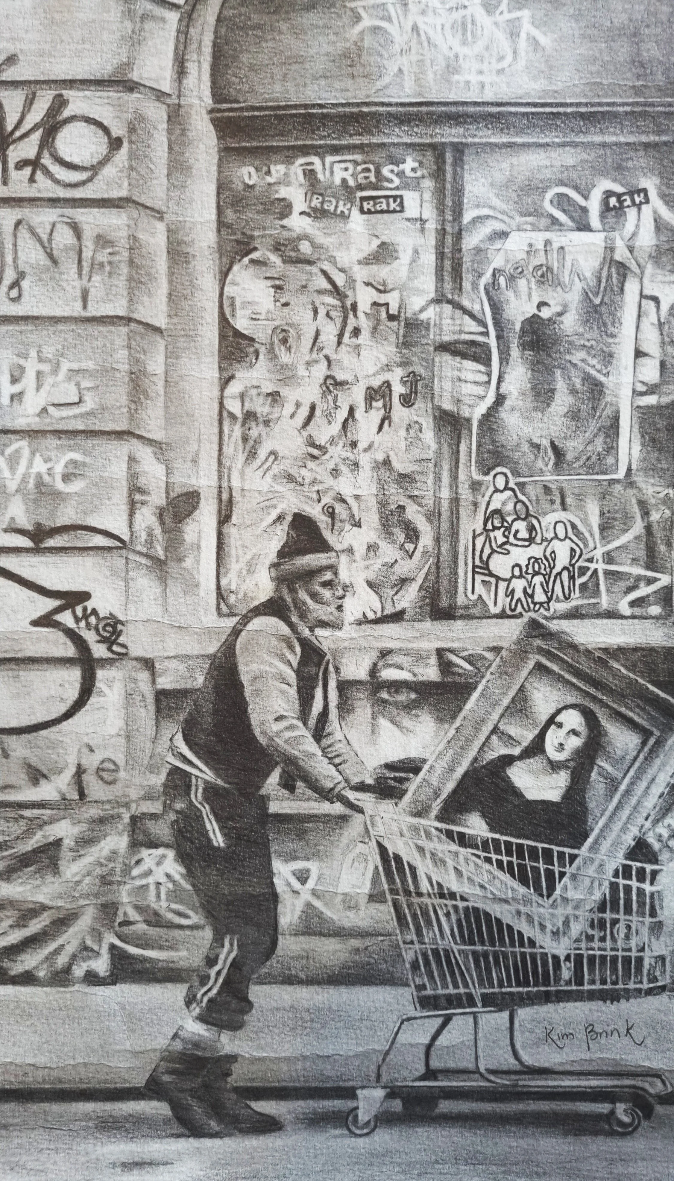 The detailed graphite work captures the rough texture of the wall, the casual posture of the man, and the iconic image of the Mona Lisa in a juxtaposition that invites curiosity and contemplation. Each element in the drawing adds to the narrative, making it a conversation starter and a thought-provoking addition to any art collection.